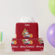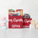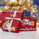Den moderna julklappen figurerar i för barn, med tomten, Julgran, mycket presenter, hälsning "God jul" i snyggt typografi och personlig namn. På Julafton röd bakgrund.