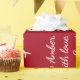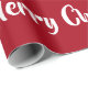 Den moderna julklappen för barn med ord "God jul" i snyggt typografi, en personlig som nu lyder "To Amber / with kärlek / from Santa," snöflingor, en illustration av en enhörnig som drar tomten i sitt sleigh och Julafton träd. På röd bakgrund.