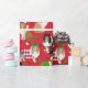 Cute Shetland Sheepdog klädd i festliga helgdag, jultomter och glasyssare med utspridda julprydnadsföremål på vit bakgrund.