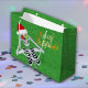Den här presentpåsen är grönt med ett spektrum av ljust guld och ett skelett som håller glansigt ornament ända fram till ögon och bär en röd Jultomten hatt med God jul-text i glansig guld-skrift på framsidan och baksidan.