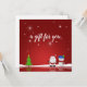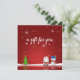 En söt julillustration med snögubbe, Jultomten, Julgran, snö och stjärnor på röd bakgrund.