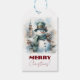 En vacker julklapp märkre att lägga på dina gåvor till vänner eller familj, av en snövinter hemma med ett stort snögubbe framför sig