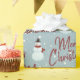 Röda God jul och snögubbe på vinterblått med snöflingor.