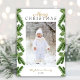 Vackert helgdag-kort med snowy evergreen grenar och ditt favoritfoto på helgdag. En enkel perfekt och en med kort för elegant för familj och vänner.