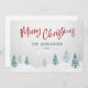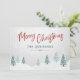 Rustic land helgdag platta kort med "God jul" i ett handskrivet stil tillsammans med din personlig familj namn eller namn och året, allt i grönt med röd vintage och gräs. En vacker scensyn på träd och vintern snö i stil-teckningar med vattenfärg framhäver kortets framsida. Kortets baksida innehåller textutrymme för ditt personliga helgdag eller kan lämnas tomt för att du ska kunna skriva ett meddelande om det behövs. Finns i högkvalitativt utskrivet kort lagrar för standardutskick eller ett nedladdningsbart digitalt format som snabbt och enkelt kan skickas via SMS, e-post eller till och med självutskrift.