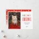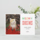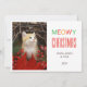 Ett julkort med foto för kattälskare. Till vänster finns ett platshållar-foto på en söt rödbrun kattunge bland röda och gröna juldekorationer. Till höger finns texten: "Meowy Christmas" med stora versaler, och namnen på familjen och katten i mindre svarta bokstäver under, med året under dem. Ordet Meowy har bokstäver i olika färger: rött, grönt och orange. Ordet Christmas är rött.