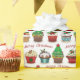 Färgfulla julgodis, kakor, muffinsar och krämer med röd text "God jul".