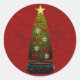 Julgran med rödbögar, snö flingor och en gult stjärna.