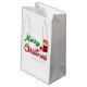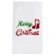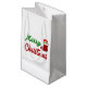 Gift-säckar med God jul i 3D-grönt, röd text och en julklapp. Mjuksäck finns i många storlekar.