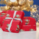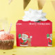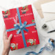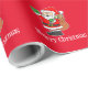 God jul Tecknad Santa Red som slår papper. Underbar helgdag som är papper för alla dina julbehov. Underbar för ett barn eller en vuxen. Den har en söt tecknad som viftar och leker tomten och ord God jul i vitt. Röd bakgrund.