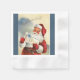 Tomten är varmt klädd i ett rött Santa kostym och matchar röda halvor och en julhatt. Han håller ett presentpaket inslaget i blått band med en blå bugg och hälsning märkre. Titta på de där röda kindorna! Hälsning: God jul till alla! Bild av ett hälsningskort för Vintage-julen med anpassningsbarna blå gräns.