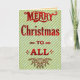 Den här festliga hälsningskortet har ord "God jul till alla" i ljusröda bokstäver med olika typsnitt och blomning. Vid grund har den större maltesletoblomma med grönt löv och små röda bär. Allt detta vilar på en ljust grönt, randad bakgrund som är utformad för att se missfärgad och spräcklig ut på ett vintage/antika sätt. Insidan har en vintage som är sliten och färgad med fler vita fläckar som ser ut som att falla snö. Det finns också utrymme för dig att lägga till ditt personliga meddelande - eller helt enkelt ta bort exempeltexten för att lämna den tom. Du kan också klicka på "Anpassa" om du vill ha fler funktioner, t.ex. att lägga till ett eget foto på insidan av den lämnat sidan. Det här är ett enkelt, gammaldags kort på eleganten för vintern i julafton. Se matchande objekt i vår butik.
