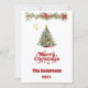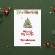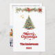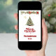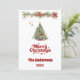 En vit bakgrund, röd text och foto på framsidan. Dekorerad med en Julgran och en gräs-garland med röda poinsettiablommor. Din text och namn på baksidan. God jul är skrivet med ett stil-retro-teckensnitt. Tillbaka: en 7-fotokollage av ditt år under granskning.