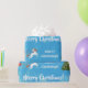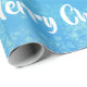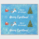 Den moderna julklappen med ord "God jul" i snyggt typografi, snöflingor, en illustration av en enhörning (med en mane och svan med rött och guldfärgat glitter) som drar tomten i sömnen, och en Julafton träd. På blå bakgrund med snöflingor. Observera att du kan anpassa det mindre hälsning med ett barns namn.