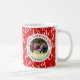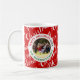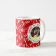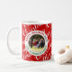 God jul-typografi och fotoröd helgdag-kista mugg. Den visar texten: "God jul" i skripttypografi och ett familjefoto i en cirkel på framsidan och baksidan.