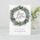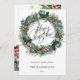 God jul kalligrafibrev på ett sött och färgstarkt vattenfärgat Helgdag för julkrans. Utandningsegenskaper vattenfärg och bladskum, färgstarka bär och guldaccenter.