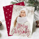Cute helgdag-fotokort med "God jul", som finns grund på kortet i ett handskript för kranbär. Anpassa det visuella julkortet med ditt lodrät foto och din familj namn. Kortet återgår till ett tranbär och vitt snöflingor mönster.