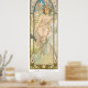 Alphonse Muchas vackra poster i Art nouveau är en del av fyra dekorativa paneler som kallas "Dagens tider". Från 1899 publicerade F. Champenois i Paris, varje panel representerar en annan tid på dagen, med "Morgonvaknandet" som fångar den fredliga atmosfären i tidigt morgon. Gräns i varje panel skapar illusionen av ett utbyggt ram eller dekorerat fönster, med unika blommönster bakom varje gräns. Den här poster är perfekt för att lägga till lite vintage elegans till vilket rum som helst och är ett måste för fläkt av Art nouveau design och Alphonse Muchas koniska teckningar.