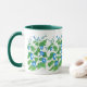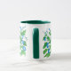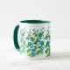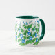 En söt Ringer Mugg med en mönster av ljusblå morgonblommor och en mörk grönt fälg och handtag, från en vattenfärgsdesign av Judy Adamson.