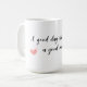 "Få era varningar med den här upplyftande mugg-designen! Med frasen "En bra dag börjar med en bra stämning" vid sidan av söta handdragna hjärtan, är mugg det perfekt sättet att sparka ut er dag med positiv inställning. Vare sig du tappar på morgonkaffe eller gillar te, kommer den här muntra påminnelsen att öka humöret och ange tonen för en underbar dag. En underbar gåva eller personlig plocka-jag-up för alla som tro i början av högerna!"