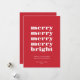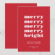 Ett modernt, elegant, elegant, Julhälsningar kort med minimalistisk typografi och en ren och enkel sammansättning i en ljus julröd färg. Märk och bra tema för att upprepa "merry"-texter som leder till "bright". Anpassningsbar Julhälsningar och namnteckning nedan. Förfinade minimala semesterhälsningar för dem som uppskattar största enkelhet och elegans. Behöver du hjälp med att anpassa eller anpassa? Kontakta oss. Vi är lycklig för att hjälpa till. Jag önskar dig de lyckligaste helgdagarna!
