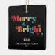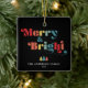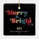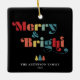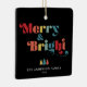 Den här fyrkantiga Julgran-dekorationen har texten "Merry & Bright" i ett dynamiskt stil. Texten står mot en svart bakgrund och skapar en kontrasteffekt som är påfallande visuellt. Anpassa den här retoriska ornamenten med ditt namn och år. Fotografi © Storytree Studios, Stanford, CA