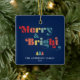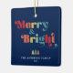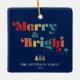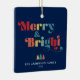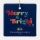 Den här fyrkantiga Julgran-dekorationen har texten "Merry & Bright" i ett dynamiskt stil. Texten står mot en mörk blått bakgrund och skapar en kontrasteffekt som är påfallande för ögonen. Anpassa den här retoriska ornamenten med ditt namn och år. Fotografi © Storytree Studios, Stanford, CA