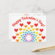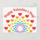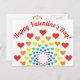 Färghjärtan i röda cirklar, orange, gult, grönt, blått, lila och rosa färg, med en böjd "Glad Alla hjärtans dag" på den.