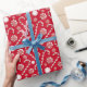Söta röda och vita godisrandor med stjärnljuspepparmint skapar ett julmönster på en röd julbakgrund. Det perfekta festliga inslaget för alla dina speciella presenter.