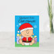 Godsons Första jul med en söt tecknad baby Santa. Baby ligger sitta framför presenter och snöflingor faller från himmel. En söt design för ett nyfött gudbarn på jul.