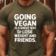 Den här bilden har en svart t-shirt med vit text som lyder "GOING VEGAN ÄR ETT UNDERBART SÄTT ATT FÖRLORA VIKT OCH VÄNNER". Texten ordnas i ett staplat format med olika teckenstorlekar och stilar för att framhäva vissa ord.