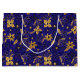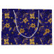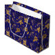 This elegant and glamorous holiday gift bag features faux gold glitter poinsettia flowers on a dark blue background. It is perfect for giving gifts and party favors.