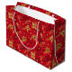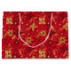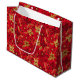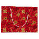 This elegant and glamorous holiday gift bag features faux gold glitter poinsettia flowers on a red background. It is perfect for giving gifts and party favors.
