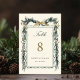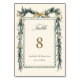 Watercolor evergreen pine garland table number with names and date. For more advanced customization of this design, please click the BLUE DESIGN TOOL BUTTON above!