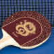 This medieval theme ping pong features a fierce gold dragon on a burgundy arch shape with gold initials. The background features a celestial pattern of stars and moons.This regal, retro look paddle adds some vintage castlecore flair to your game. Make sure to type your initials in the Personlize section.