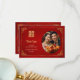 This elegant Chinese wedding thank you card features a custom photo in a circle, a golden Chinese frame and a golden happiness symbol and a headline in a modern handwritten script on a shimmering red background.