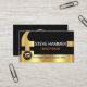 A creative negative space design of a gold hammer. Its handle is made from your prestigious name with the job title "HANYMAN" just underneath. At the base of the card is a gold home landscape logo you can use alongside a slogan caption option.