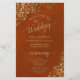 These wedding programs are elegant and tasteful, while still being budget friendly. The design features ornate golden faux foil lace with gold text on a marbled rust orange or burnt umber colored background. The typography features lacy script calligraphy, and there is room for details on the ceremony, the bridal party, and a short thank you.