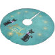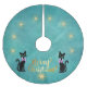 This tree skirt is teal with two black cats wearing pink bows around their necks and twinkle gold stars with gold Merry Christmas text.