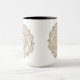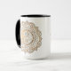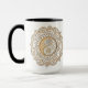 A symmetrical mandala design featuring intricate a yin yang floral pattern in gold and silver.