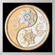 A yin yang symbol is adorned with intricate floral patterns and leaves. The design features a harmonious blend of gold and silver colors.
