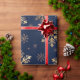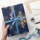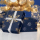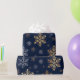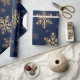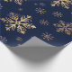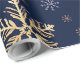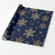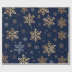 This image features a roll of elegant gift wrapping paper decorated with large, artistic gold-colored snowflake designs set against a deep navy blue background. The pattern includes various intricate snowflake shapes, some highlighted with a gold metallic effect and others in subtle contrasting tones. This luxurious and festive wrapping paper is perfect for holiday gifts, especially during winter or Christmas celebrations, adding a sophisticated and sparkling touch to any present.