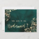 It features an emerald green background with frilly and ornate faux foil gold filigree and chic script lettering.
