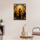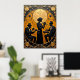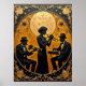 Den här ornatmålningen skildrar en jazz-trio-silhuetterad i svart mot en rikligt texturerad guld-bakgrund. En kvinna står i centrum och spelar en trumpet, med två sittande musiker, en med en trumpet och den andra med en tangentbord. Bakgrunden har ett stort, stiliserat guld måne, stjärnor och intrikat dekorativt mönster i svart och guld, vilket framkallar en glamorös och tidlös epok av jazz-musik.