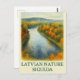 Fånga den lettiska naturens serenskönhet med detta vykort för vattenfärg-stil som innehåller den ikoniska Gauja-floden som rinner genom den vibrerande höstskogen i Sigulda. Riken i guld, orange och djup grönt hyllar den magiska charmen i Lettlands falllandskap. En perfekt som bevarar eller ger en gåva till naturen älskare och resentusiaster.