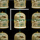 Varvets anpassningsbar har en upprepad bild av en guldfågelburk. Inuti burarna finns en fågel på gren som bortser från en vinterstuga i snö vid en strömma mot svart bakgrund.