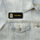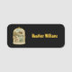 Namn bricka är svart med en gyllene fågelburk som har en fågel på ett gren som bortser från en vinterkabinscen med snö inuti burarna. Anpassa ditt namn med mallen.