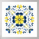 A radiant mandala-style floral design featuring symmetrical yellow and navy-blue blossoms with soft blue accents