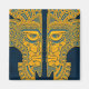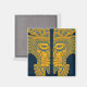 Ett par Aztec-inspirerade masker är ansikte mot varandra och skapar utseendet på en tredje mask som tittar framåt. Linjer och cirklar målas upp i en gyllene gult färg som framhävs för att ge en nyck på yta. Bildens insida och bakgrund avslutas med djupblåa skuggor som springa längs mitten i mönstret mellan de två maskerna. Bildens snäva beskärning skapar ett aggressivt mönster som verkligen står ut på den här magneten. Denna snyggt Aztec-design ser ut att vara en gammal artefakt med modern känsla.