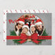 En modern fotojulkortsdesign med ditt familjefoto som lyfts fram av ett gyllene ram och som är bundet till ett rött julband. Din namn nära grund-högerna.